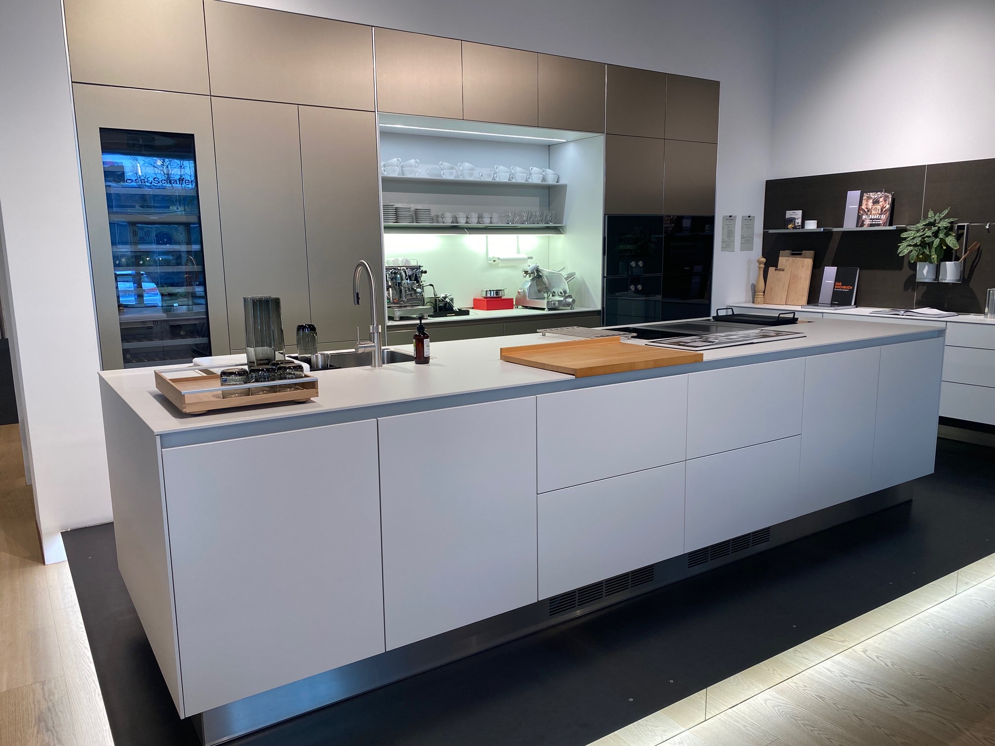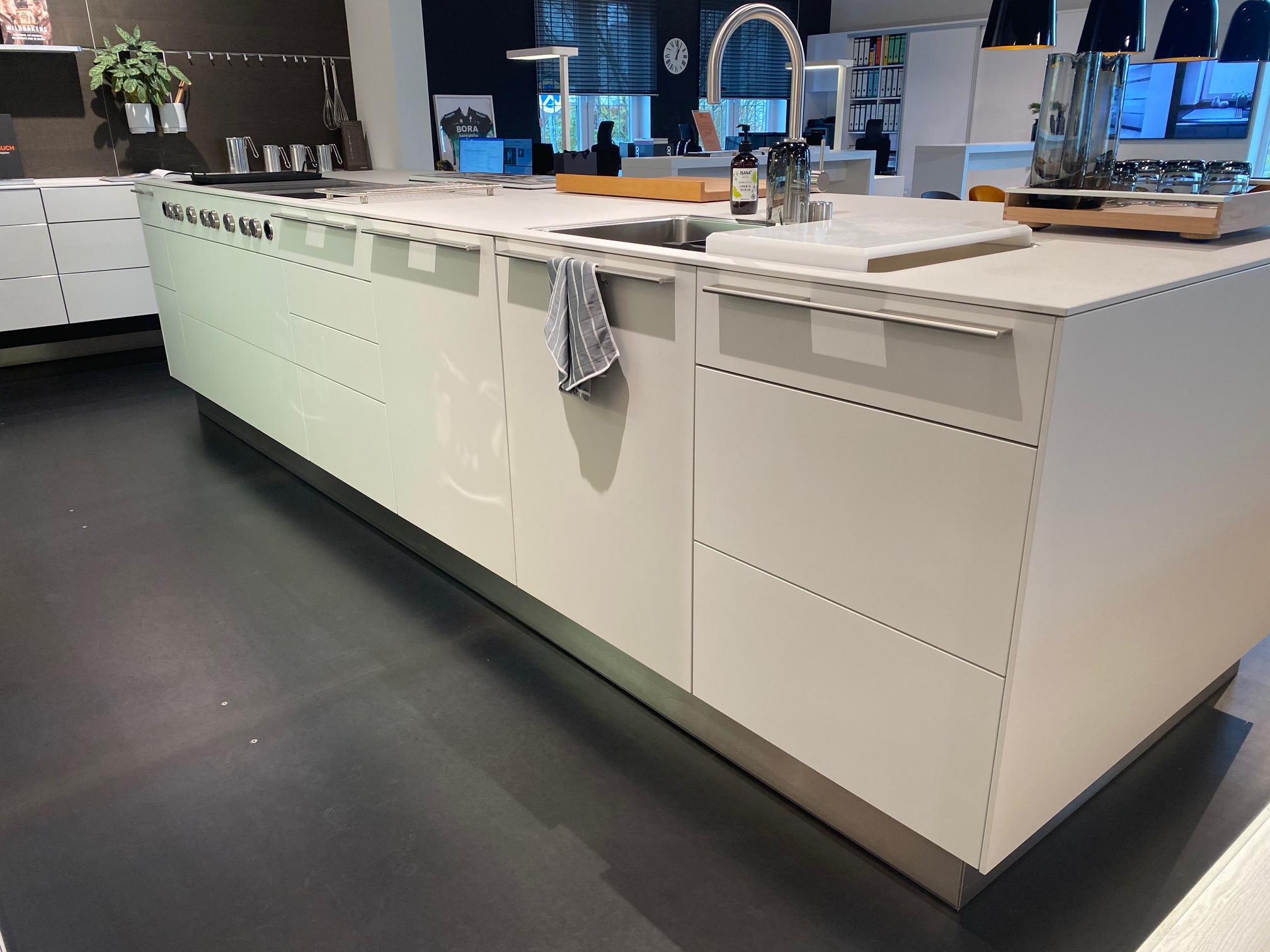 Bulthaup DFK2 Kunststoff kaolin, Konbination Griffe und grifflos, Arbeitsplatte Kunststoff 1 cm stark mit eingeklebter Spüle und flächenbündiger Kochfeldlösung Insel: 392 cm breit, 123 cm tief, Arbeitshöhe: 97 cm, Programm DFK2 Kunststoff kaolin Vorführküche, daher reichhaltige Innenausstattung ohne Geräte: inkl. Spüle Bulthaup Abholpreis: Euro 14.900.-- |